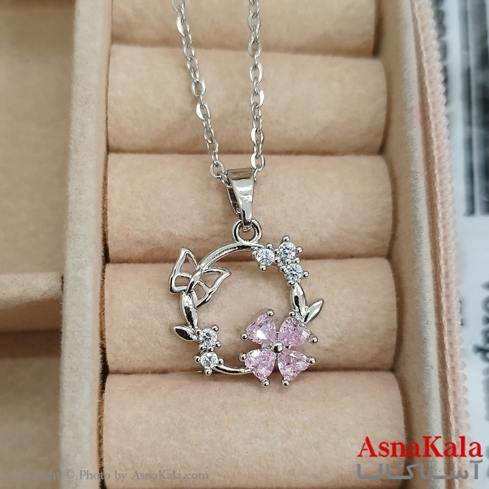 گردنبند استیل گل و پروانه جواهری نگین صورتی کد GNB162439W