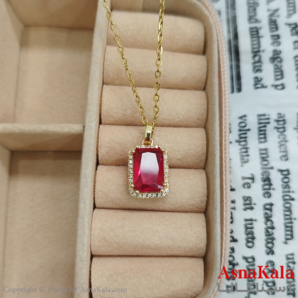 گردنبند استیل مستطیل جواهری نگین قرمز کد GNB162458W