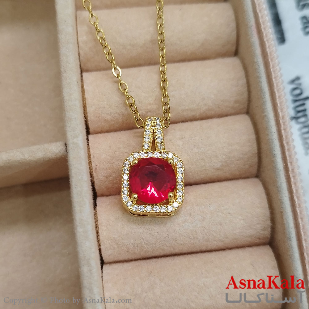 گردنبند استیل مربع جواهری نگین قرمز کد GNB162459W