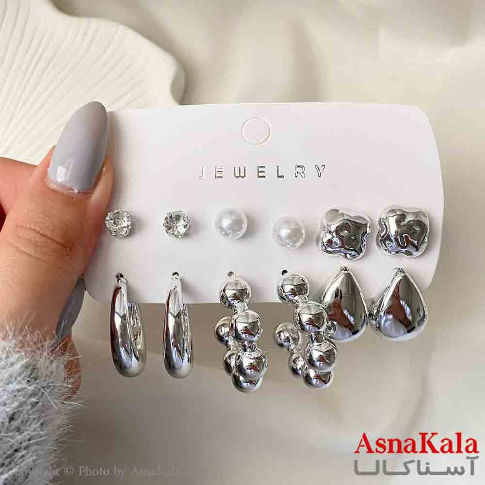 گوشواره زنانه استیل پک 6 جفتی مدل گوی و مروارید فانتزی رنگ نقره ای کد GSH151937W