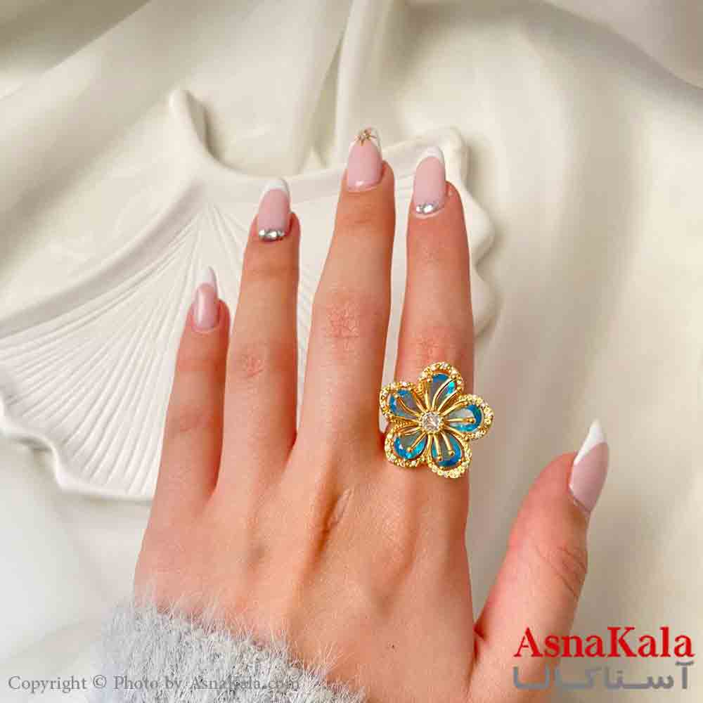 انگشتر زنانه استیل مینیمال مدل گل نگین آبی فری سایز رنگ طلایی کد ANG19869W