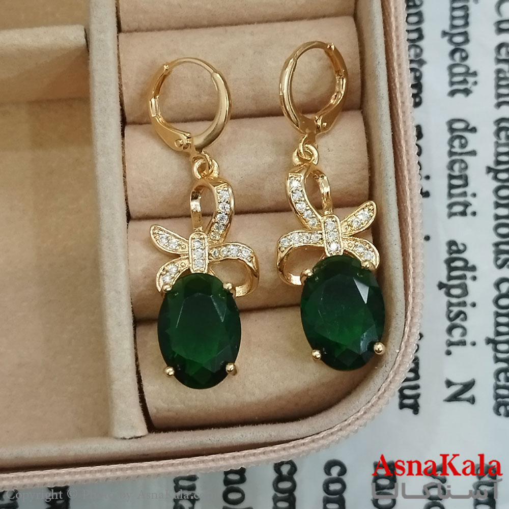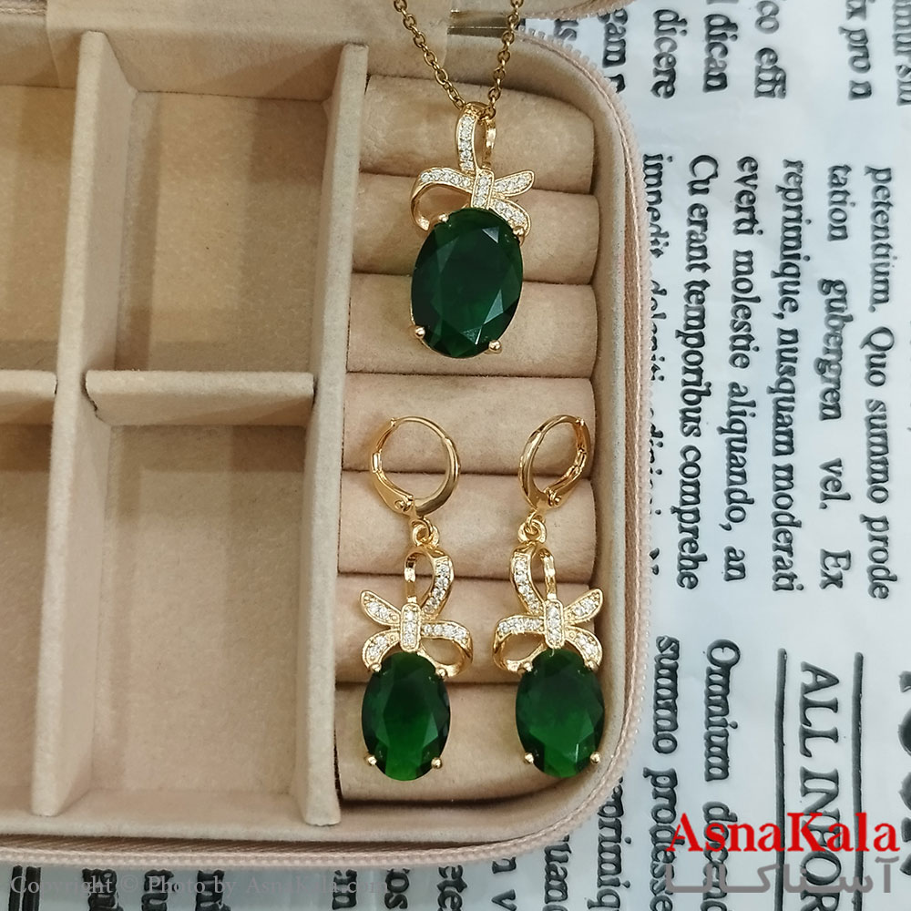 نیم ست زنانه شامل گردنبند و گوشواره مدل پاپیون نگین سبز رنگ طلایی کد NIM141109W