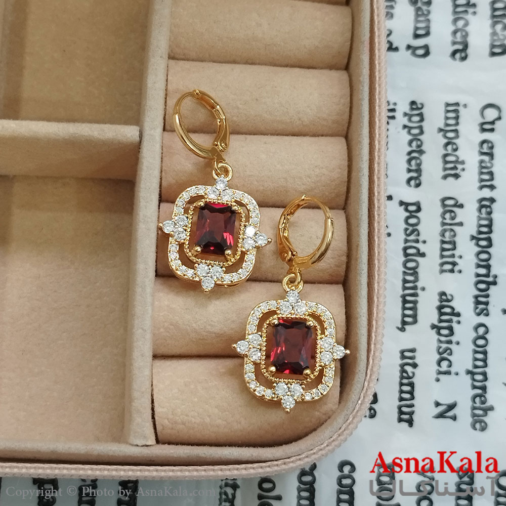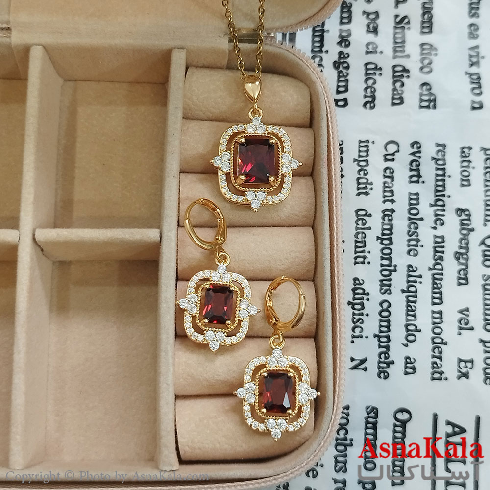 نیم ست زنانه شامل گردنبند و گوشواره مدل مدرن جواهری نگین قرمز رنگ طلایی کد NIM141119W