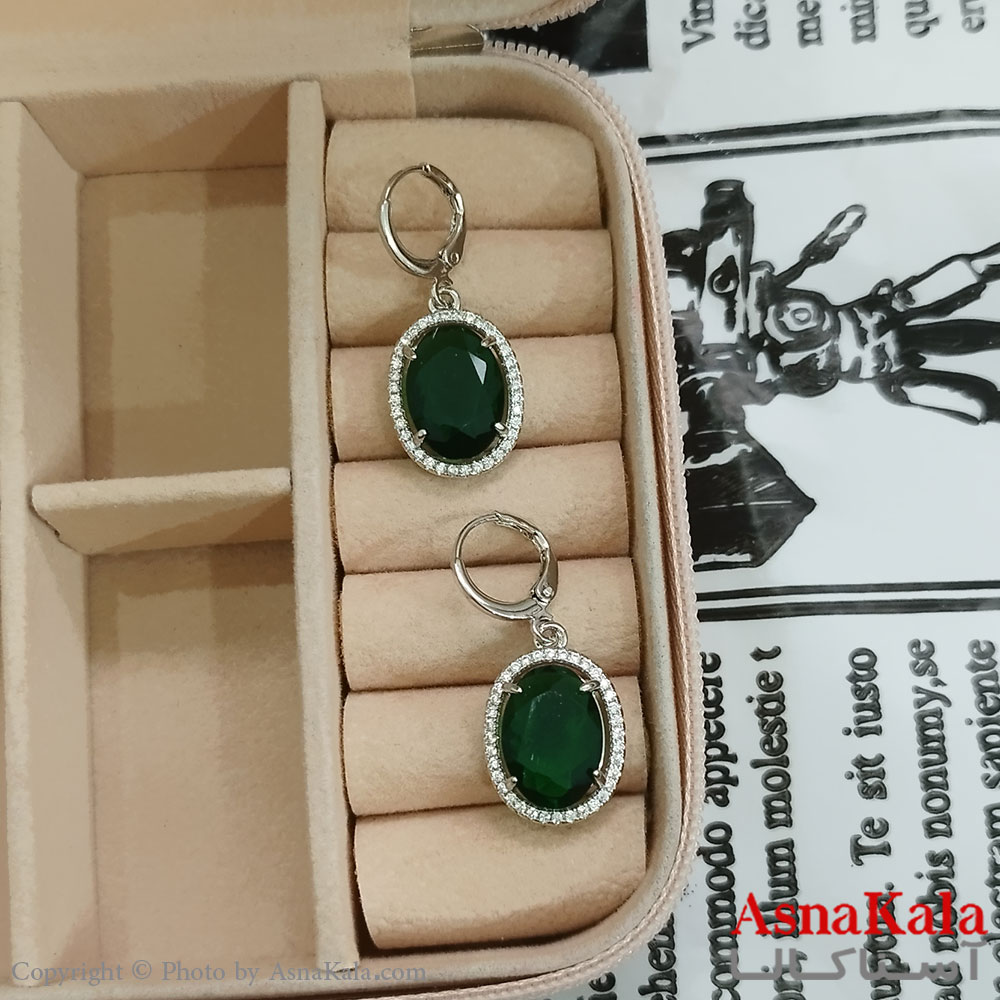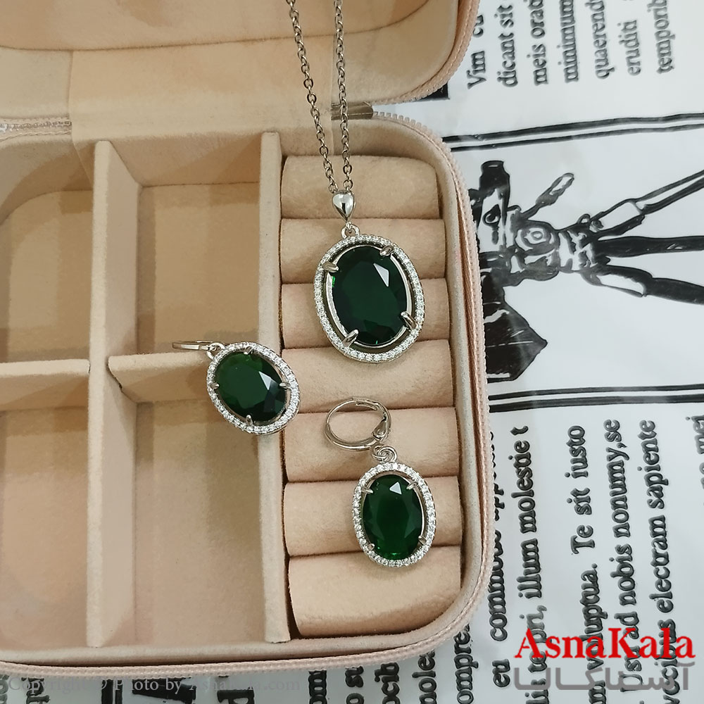 نیم ست زنانه شامل گردنبند و گوشواره جواهری نگین سبز رنگ نقره ای کد NIM141128W