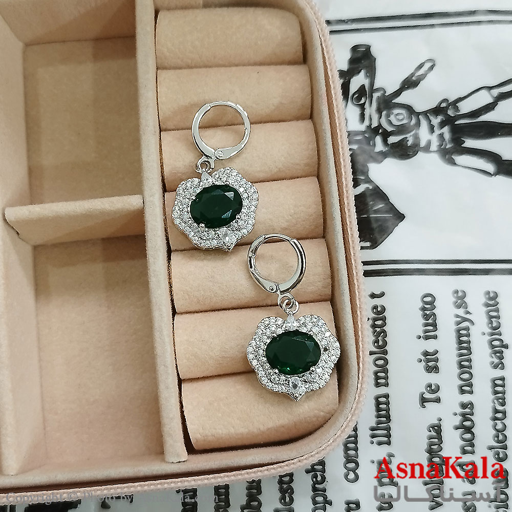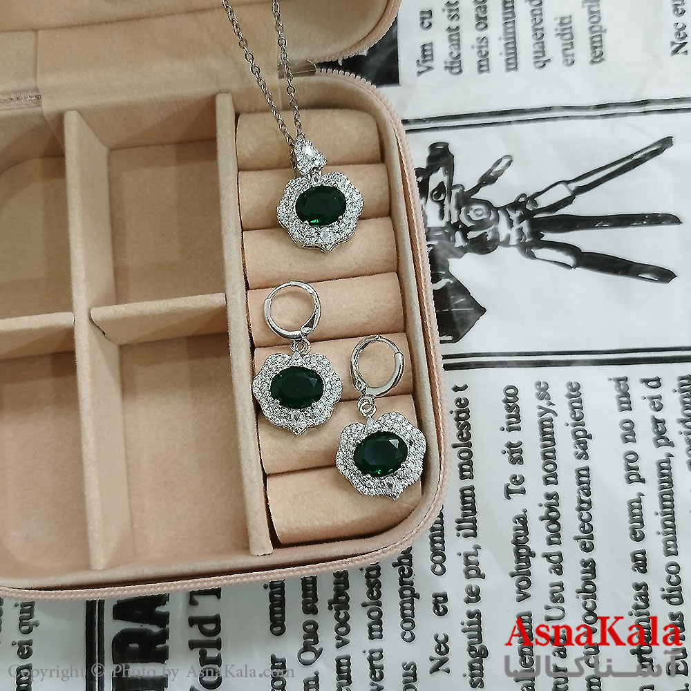نیم ست زنانه شامل گردنبند و گوشواره جواهری نگین سبز رنگ نقره ای کد NIM141130W