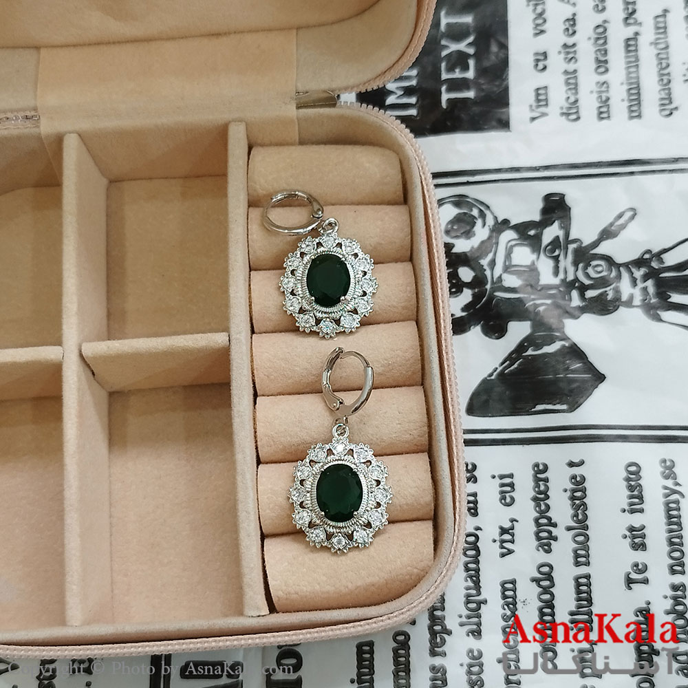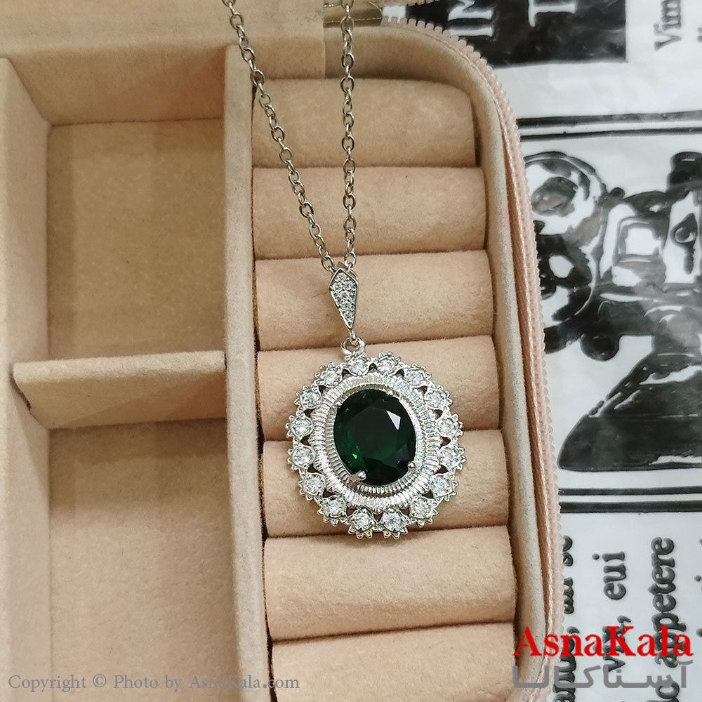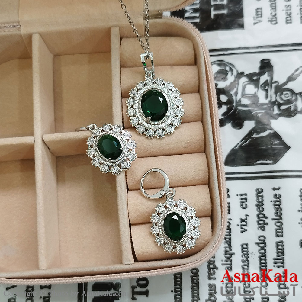 نیم ست زنانه شامل گردنبند و گوشواره جواهری نگین سبز رنگ نقره ای کد NIM141138W