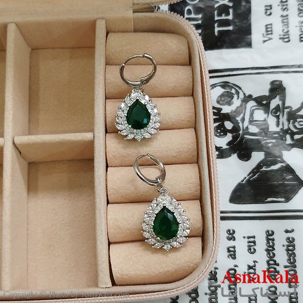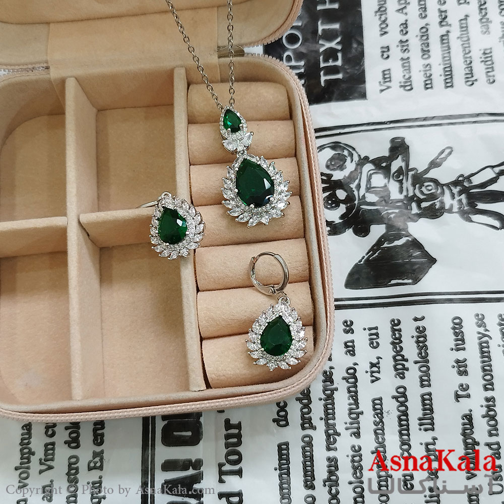 نیم ست زنانه شامل گردنبند و گوشواره جواهری نگین سبز رنگ نقره ای کد NIM141140W