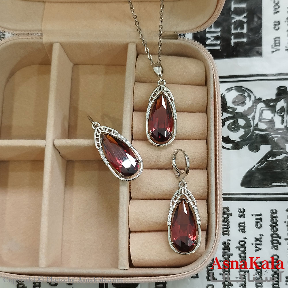 نیم ست زنانه شامل گردنبند و گوشواره جواهری نگین قرمز رنگ نقره ای کد NIM141136W