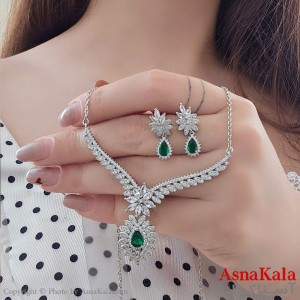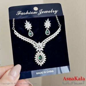 سرویس جواهری زنانه طرح مجلسی مدل اشکی نگین سبز آبکاری رادیوم کد NIM14558W