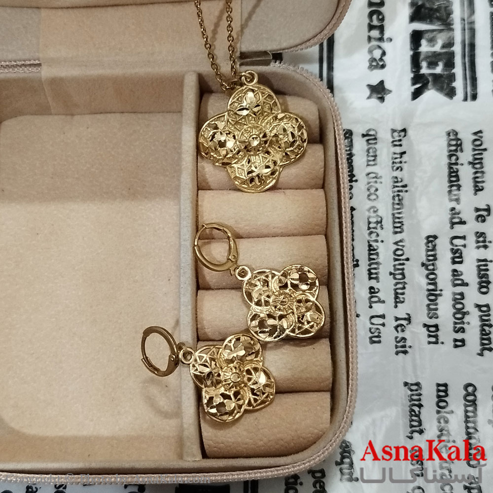 نیم ست زنانه طلاروس، جنس آن از برنج رنگ ثابت که تشکیل شده از یک عدد گردنبند و یک جفت گوشواره طلاروس در بسته بندی هدیه از فروشگاه اینترنتی آسناکالا خریداری شود.
